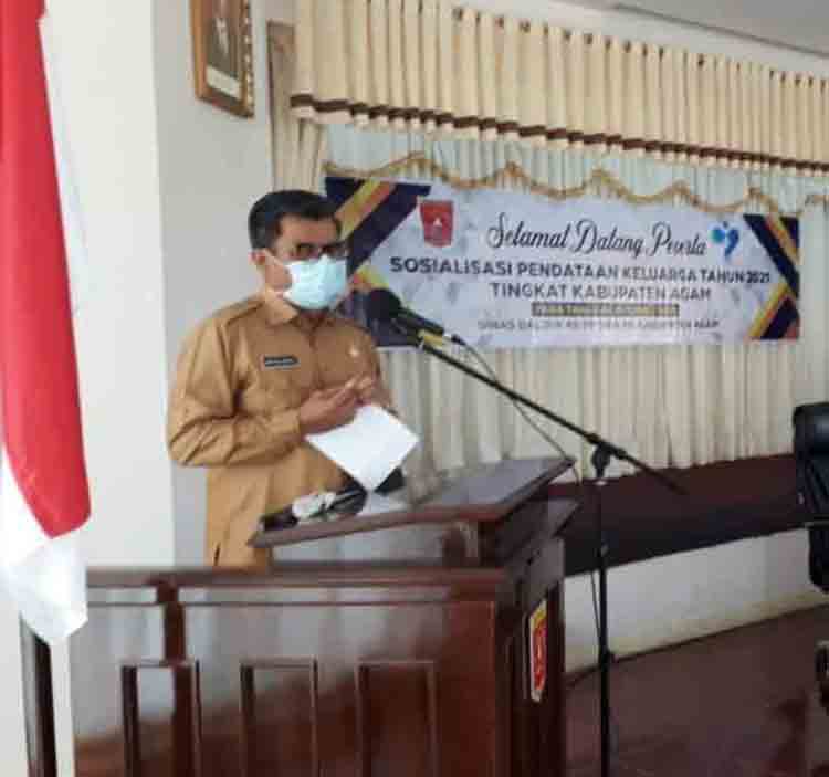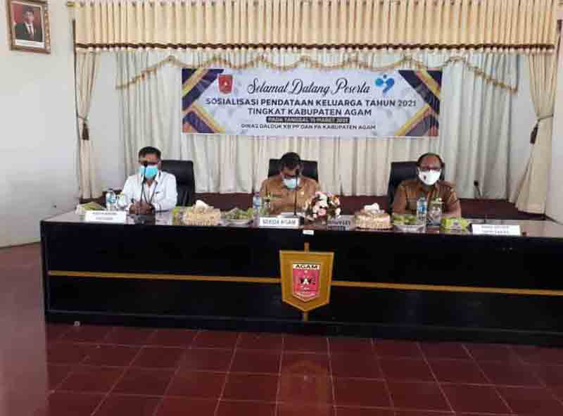 Dinas Pengendalian Penduduk Keluarga Berencana Pemberdayaan Perempuan dan Perlindungan Anak (Dalduk KB PP & PA) Kabupaten Agam menggelar Sosialisasi Pendataan Keluarga 2021 bagi Kepala OPD dan Camat se Kab Agam di Aula Utama Kantor Bupati Agam, Senin 15/3/2021.